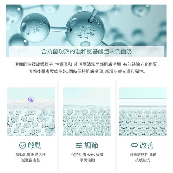 含抗菌功效的溫和氨基酸泡沫洗面乳,潔面同時釋放銀離子,性質溫和,能深層清潔面部肌膚污垢,有效祛除老化角質,潔面後肌膚柔軟不乾,同時保持肌膚滋潤,增加皮膚光澤和彈性。