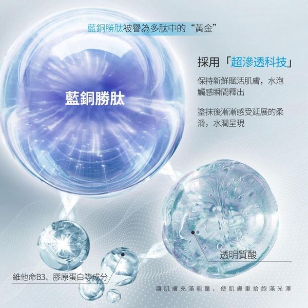 藍銅胜肽:有多種功能,激發細胞活力,加快新陳代謝,有特強去皺,保濕滋潤的神奇功效。持續使用能同時改善肌膚的暗黃,暗沉,乾燥,淡化皺紋等皮膚問題,使肌膚更加明亮耀眼,充滿彈性。醫學實驗證明,藍銅胜肽(Copper Peptide, GHK-Cu)能有效增生膠原蛋白,透明質酸及彈性蛋白的形成,幫助皮膚幹細胞生長,效果比傳統成份維他命C、褪黑色素、A酸等更為卓越,而刺激性亦比其他成份低。