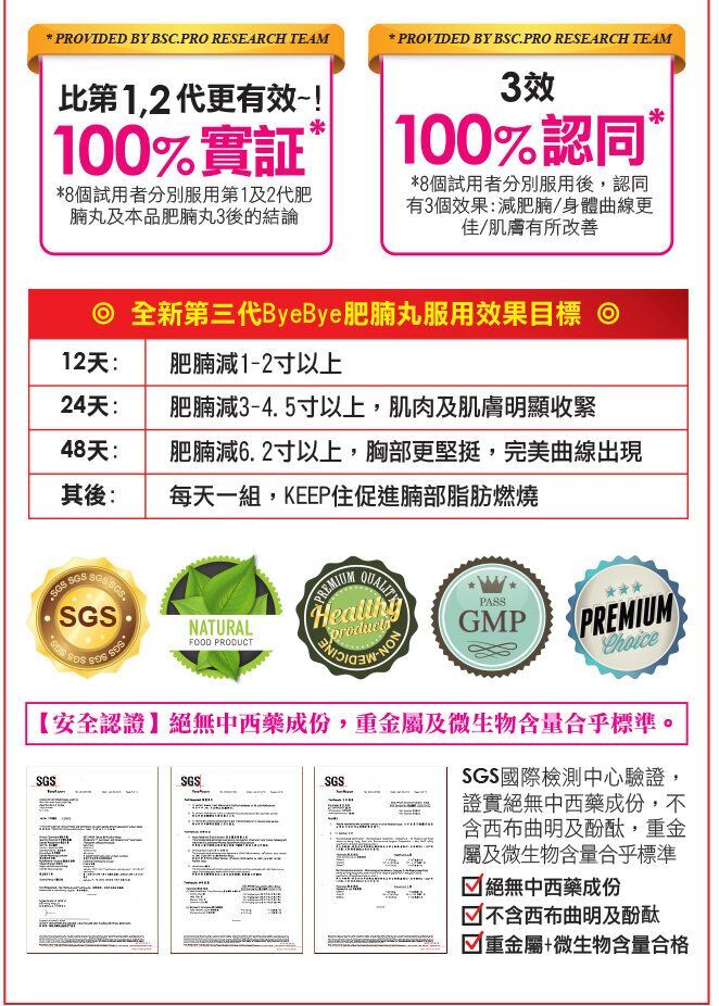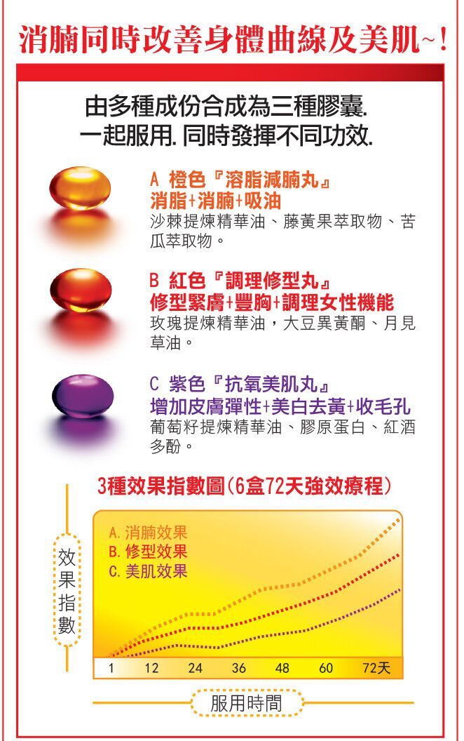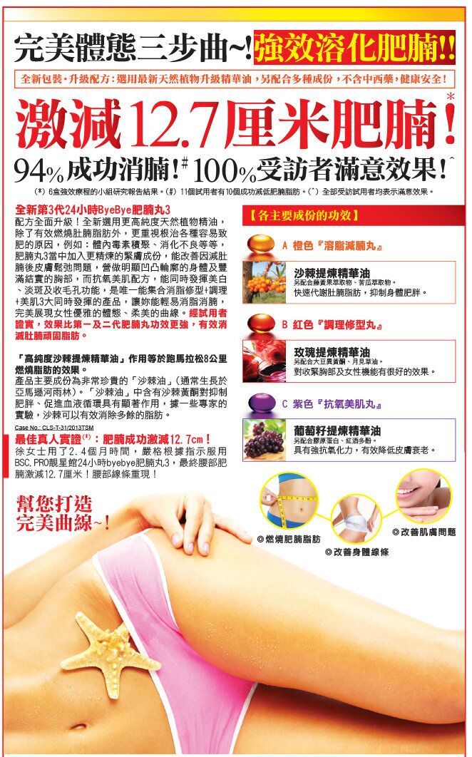 激減12.7厘米肥腩!*94%成功消腩!# 100%受訪者滿意效果!^(*) 6盒強效療程的小組研究報告結果。(#) 11個試用者有10個成功減低肥腩脂肪。(^) 全部受訪試用者均表示滿意效果。