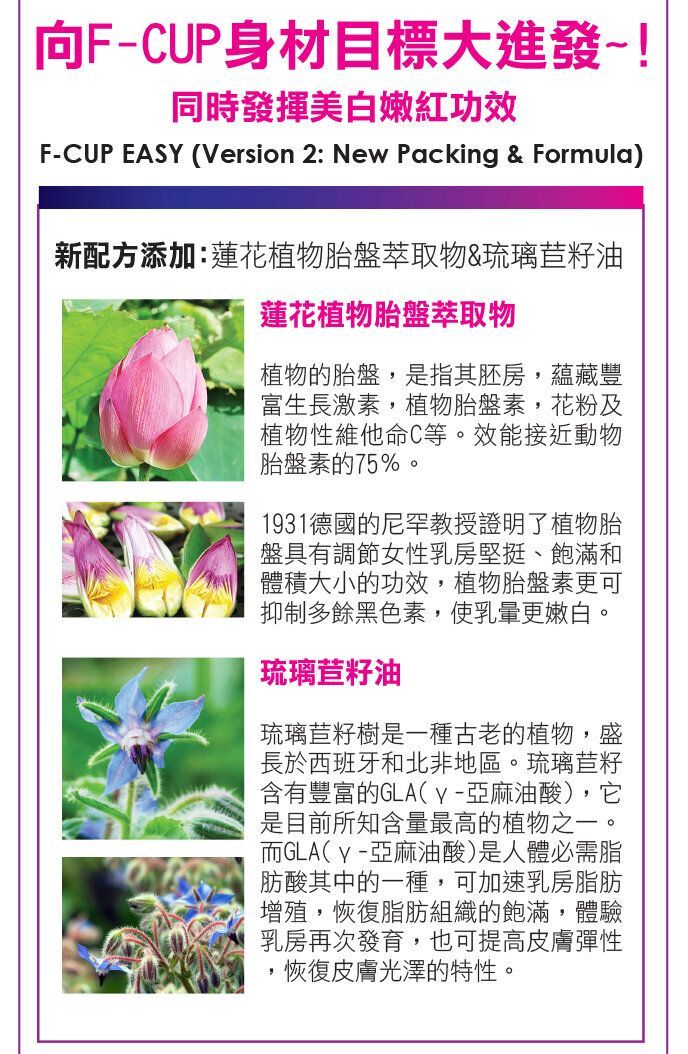 由內而外開啟回彈激大感、最新添加植物雌激素之王成分:蓮花植物胎盤萃取物及琉璃苣子油 GLA,令妳胸部再次發育,向傲人 F-CUP 身材目標進發。效果證實比第一代功效更強。