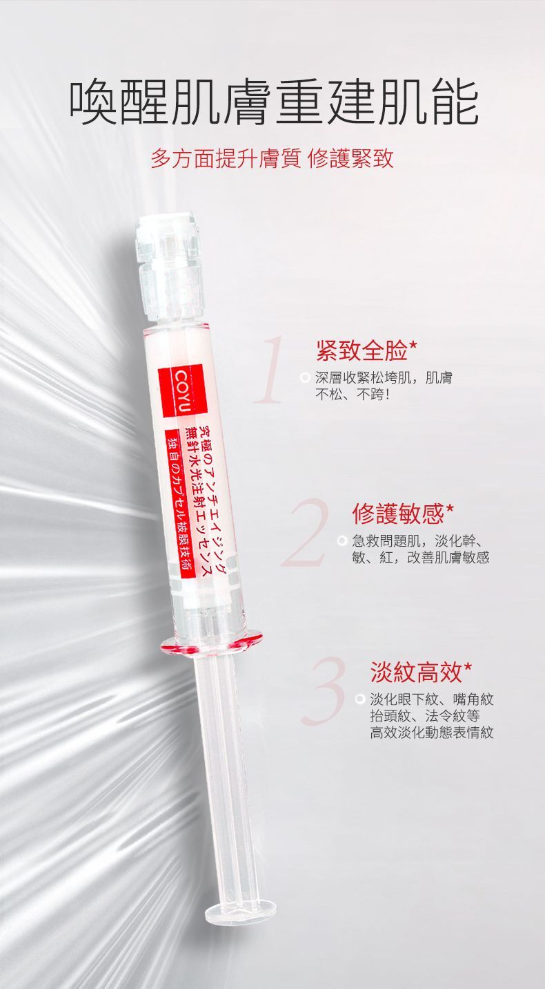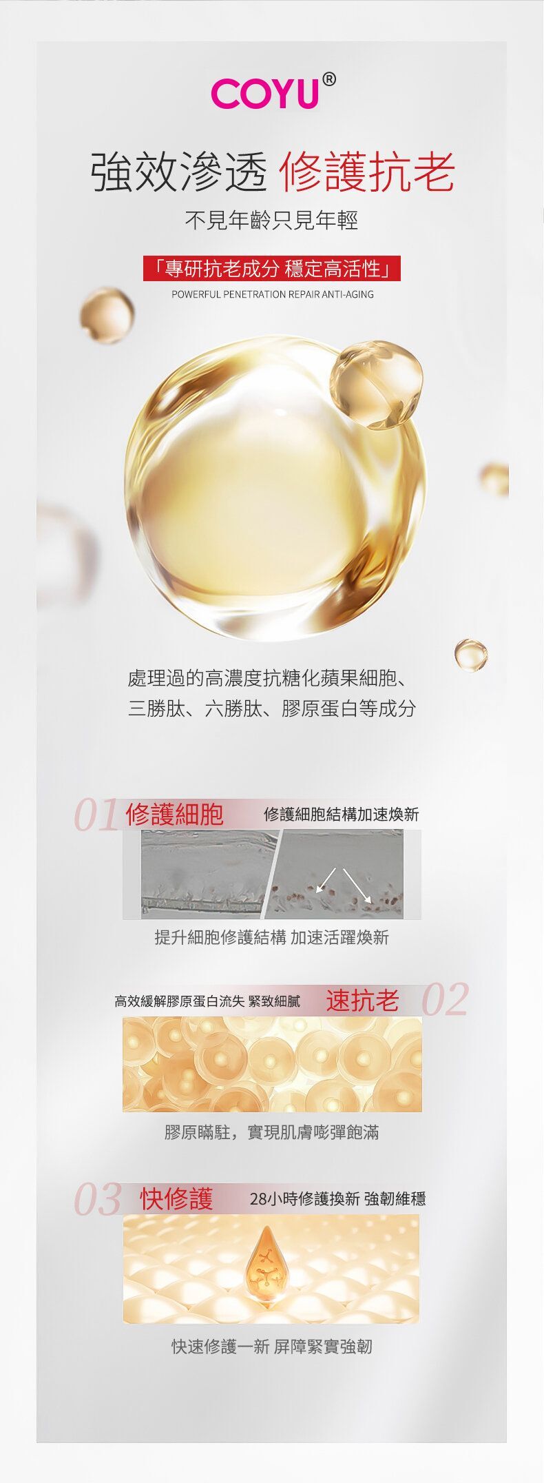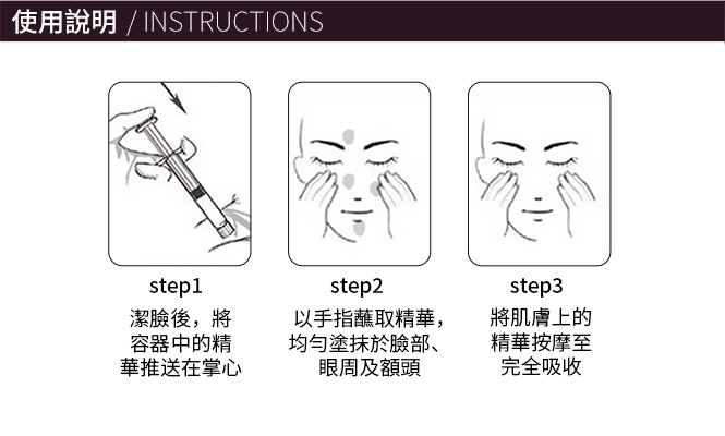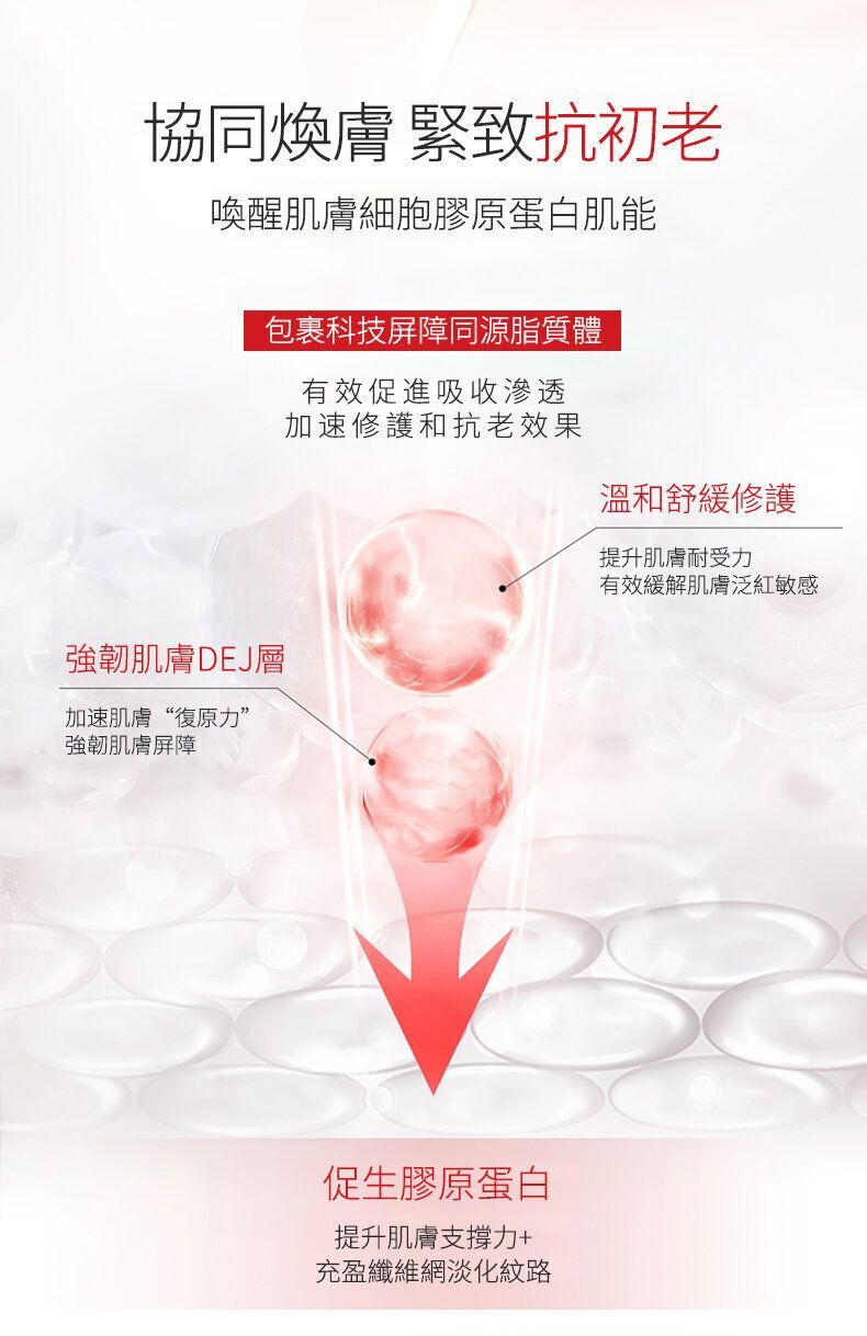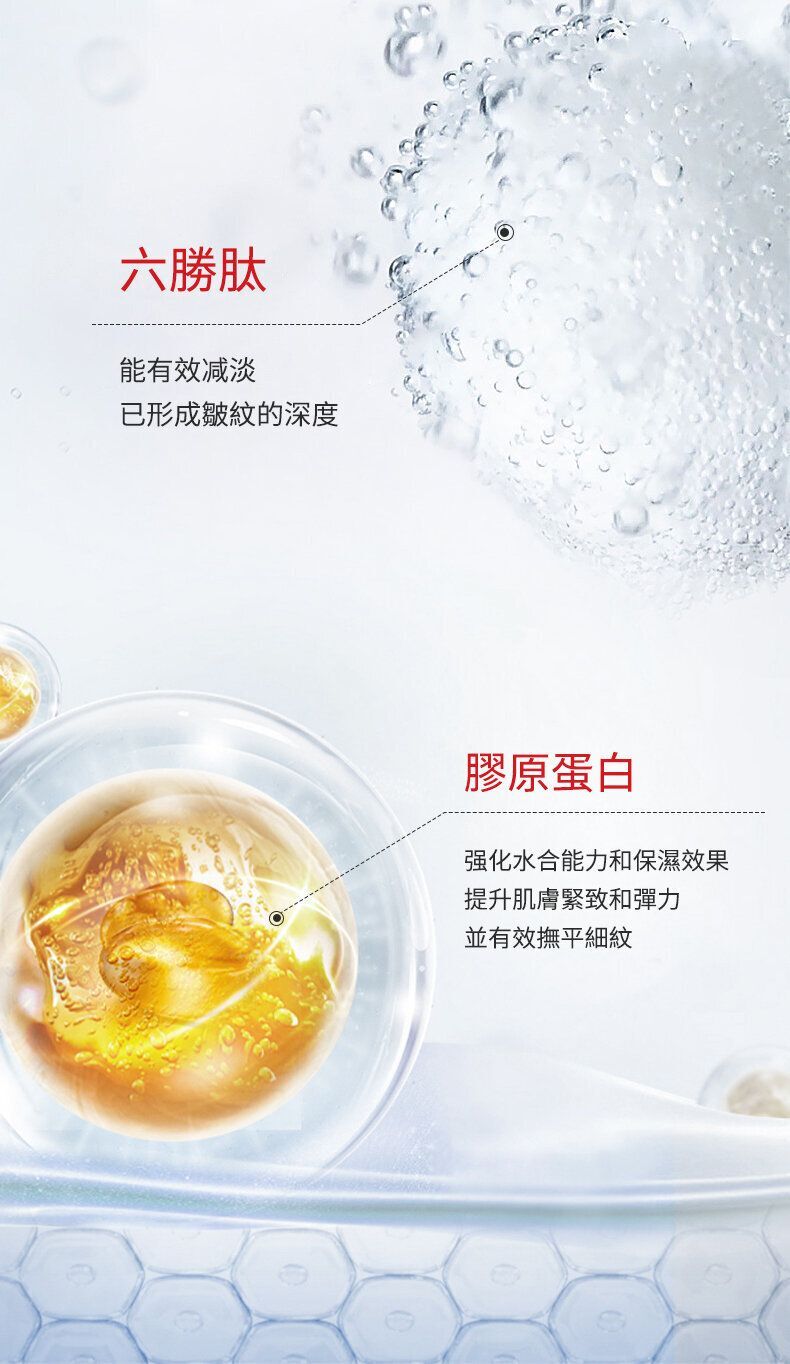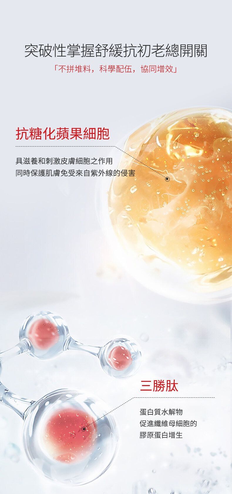將抗糖化蘋果幹細胞、三胜肽、六胜肽等成分快速滲透至肌底, 能收縮毛孔、抗皺、提拉緊致等多種功效