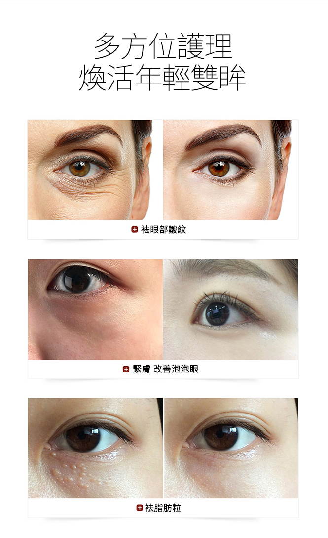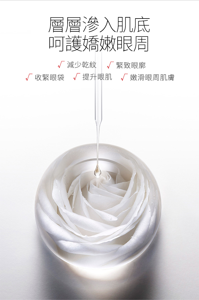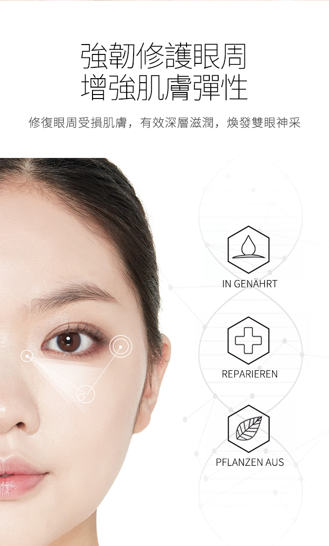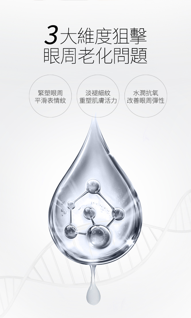 蘊含3大高科技成份 (Syn-Ake類蛇毒(三勝肽複合物),PhytoCellTec幹細胞,海洋冠狀植物幹細胞),另加入胜肽複合物(棕榈酰三肽-1/三胜肽/棕榈酰三肽-5/五胜肽/六肽-9/棕榈酰四肽-3),觸感如絲般幼滑,能完美延展並融入眼部肌底,極易吸收,即時修護累積損傷,獨特配方有助重建眼周肌膚細胞自癒系統,支援皮膚細胞的排毒淨化和同步修護,能針對性擊退眼部常見的老化迹象問題:幼紋、皺紋、鬆弛、缺乏彈性和眼袋等,令眼周肌膚回復柔軟細膩彈潤,雙眸毫無倦容明艷照人。