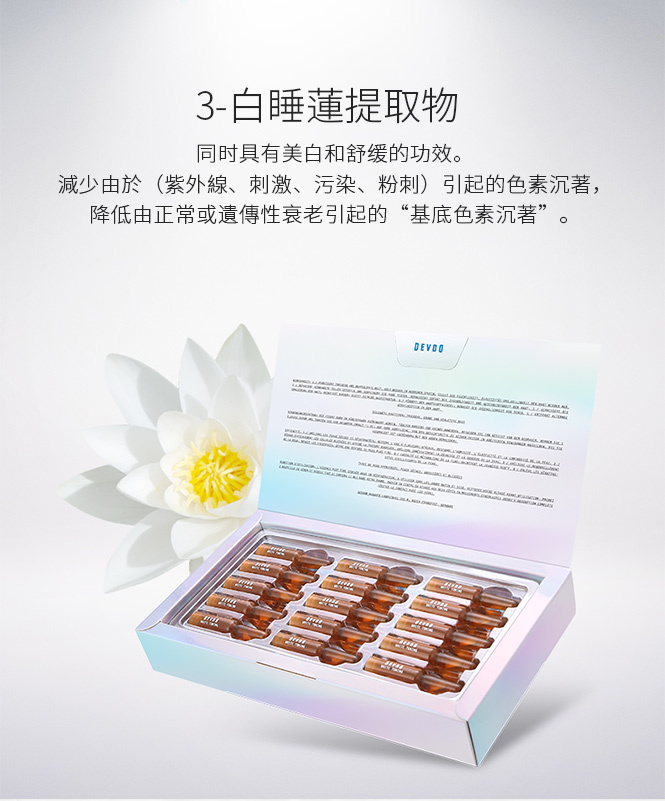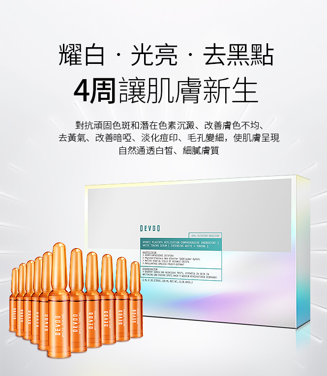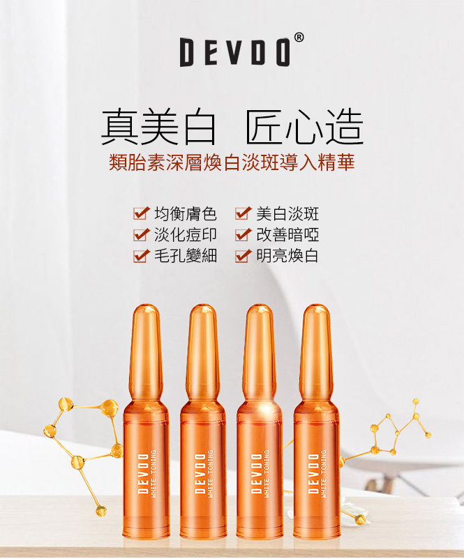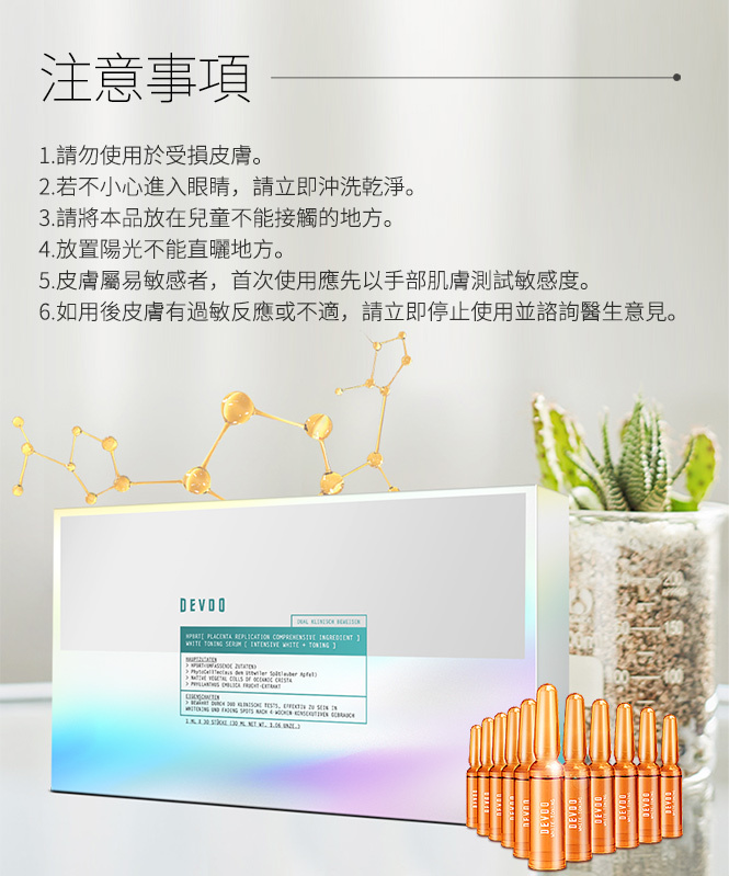 使用方法: 每天早及晚上使用,潔面後,取1支深層煥白淡斑導入精華,將整支1ml滴到掌心上,由面部中央向兩側輕輕打圈按摩至吸收 (避開眼睛周圍)。