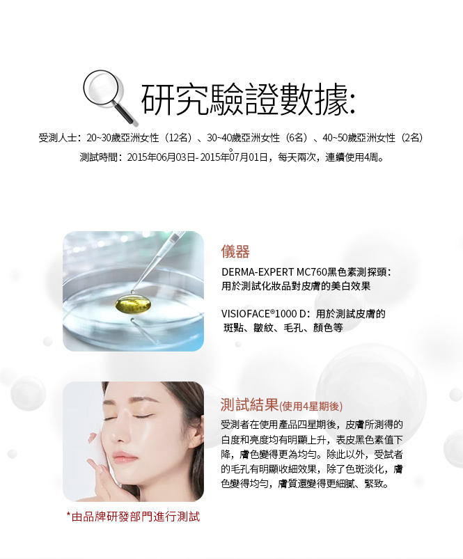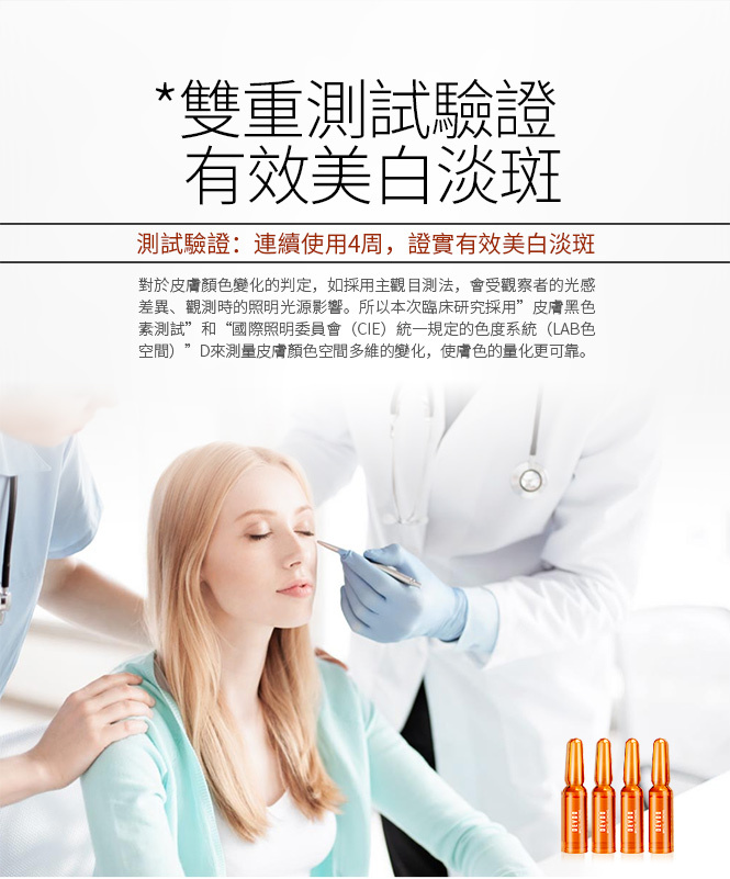產品主要成份經測試驗證,連續使用證實有效美白淡斑