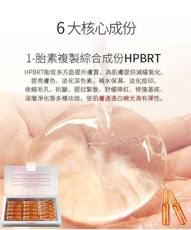 產品是由生物科技研究所開發而成的,他們深入研究東方女性的肌膚,啟發自人胎盤的科學研究,把成份與科技結合,成功研製出{HPBRT},複製人體胎盤中最具美容功效的養份(多種細胞生長因子及其他元素: 如礦物質、酵素、核酸、維他命、碳水化合物、縮氨酸、蛋白質等),以高科技分離及分析當中的原素結構,徹底複製,能發揮與人胎素一樣的美容效果而又沒有污染風險和心理的固慮。