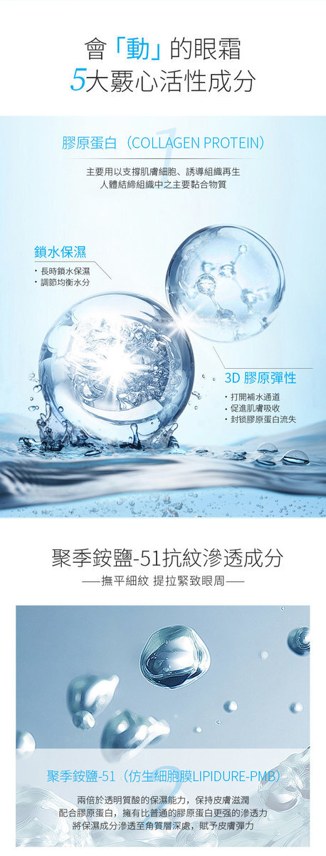 聚季銨鹽-51(仿生細胞膜Lipidure-PMB): 兩倍於透明質酸的保濕能力,保持皮膚滋潤;配合膠原蛋白,擁有比普通的膠原蛋白更強的滲透力,將保濕成分滲透至角質層深處,賦予皮膚彈力