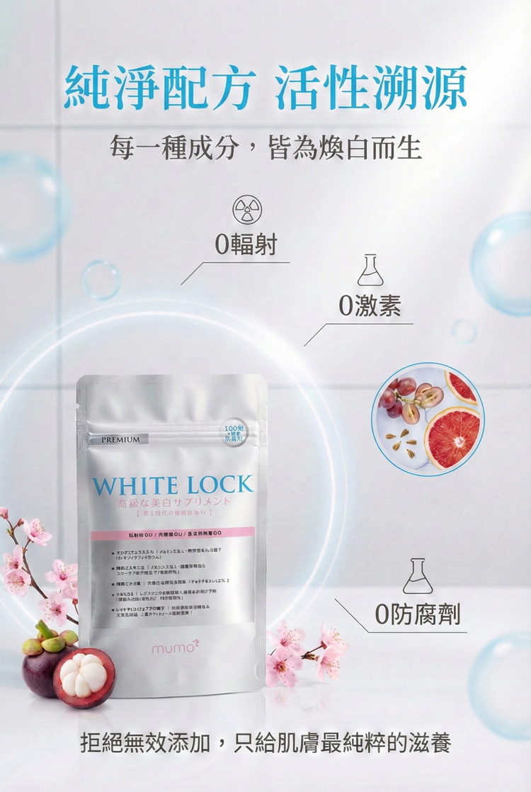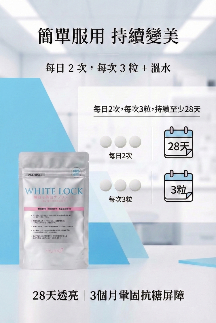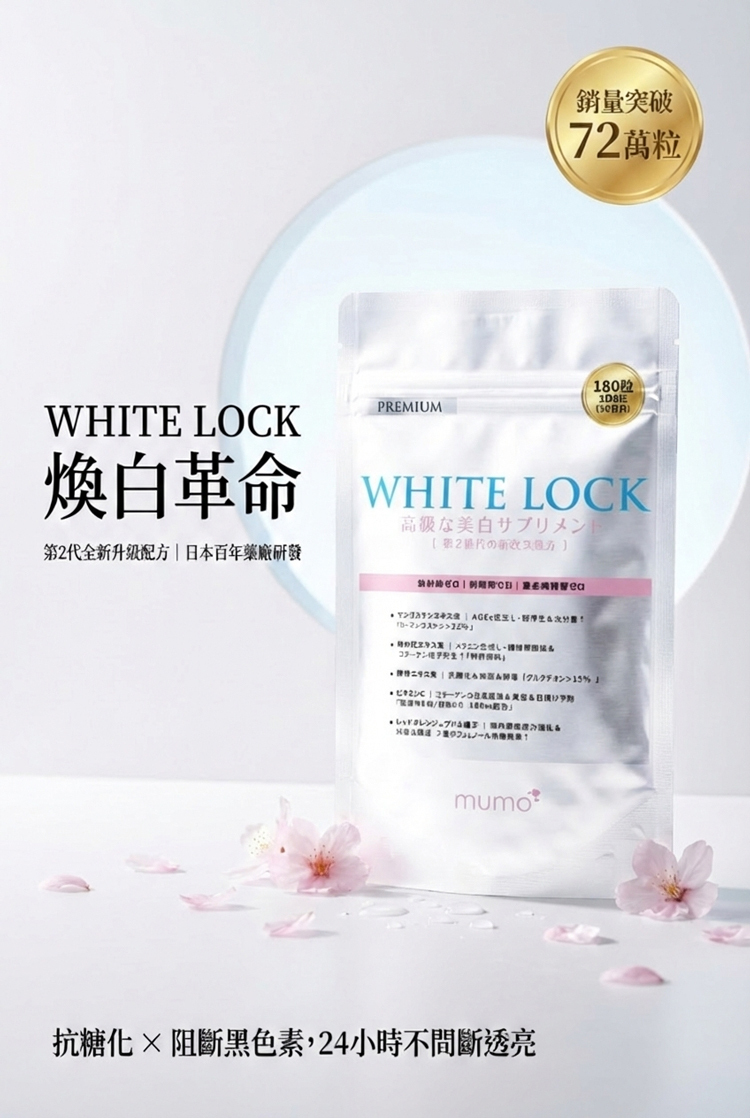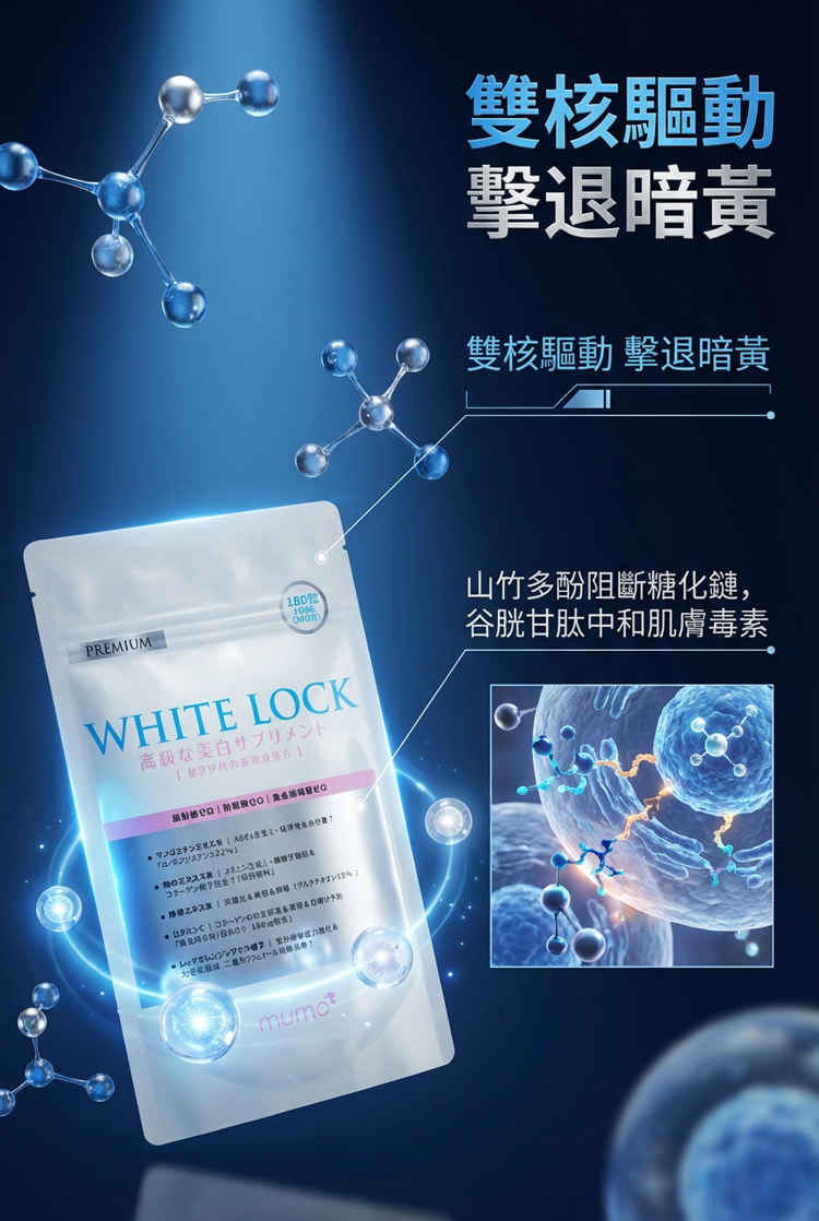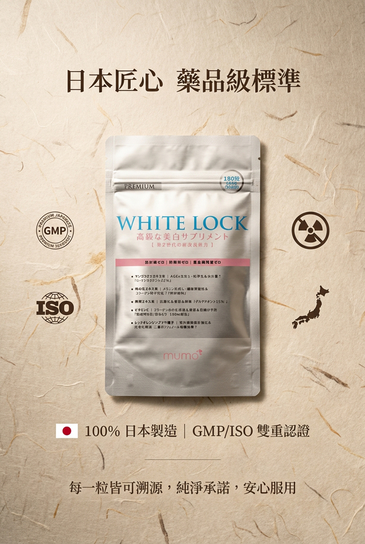 🇯🇵日本研發「第2代全新升級配方」✨ 以匠心淬鍊的煥白革命✨歷經台灣初代口碑驗證,mumo美白丸迎來⚡劃時代升級!由日本百年頂尖藥廠研發,專為「抗糖化+美白」雙重需求設計,打造亞洲女性專屬的「💊內服美白精華」。✅山竹多酚(α-倒捻子素33%) + 15%高純度谷胱甘肽✅直擊糖化衰老根源|🚫阻斷暗沉黃氣✅日本GMP標準生產|🔒重金屬/微生物/活性成分三重檢測 🚫1粒阻斷3大暗沉路徑(糖化/氧化/黑色素)