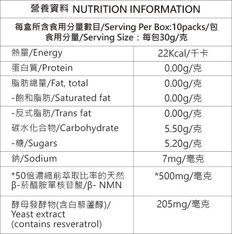 水、蔗糖、紅葡萄濃縮汁、藍莓濃縮汁、黑醋栗濃縮汁、櫻桃濃縮汁、黃原膠、酵母發酵物(含205mg白藜蘆醇)、檸檬酸(酸度調節劑)、DL-蘋果酸(酸度調節劑)、紅石榴精華、綜合發酵濃縮粉(野櫻莓、諾麗果、水蜜桃、麥芽糊精)、法國專利複合植物萃取(葡萄籽萃取、維生素C、麥芽糊精、氧化鋅、香瓜精華)、專利蘋果精華、日本專利櫻花萃取、綜合蔬果酵母發酵物(含50倍濃縮萃取比率的500mg毫克β-菸醯胺單核苷酸-NMN, *等同一般膠囊類2375毫克的身體吸收使用率)、葡萄皮萃取。