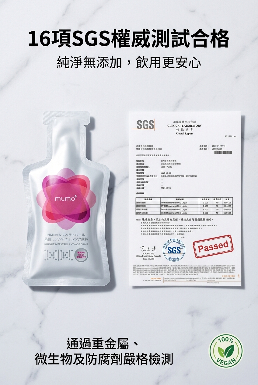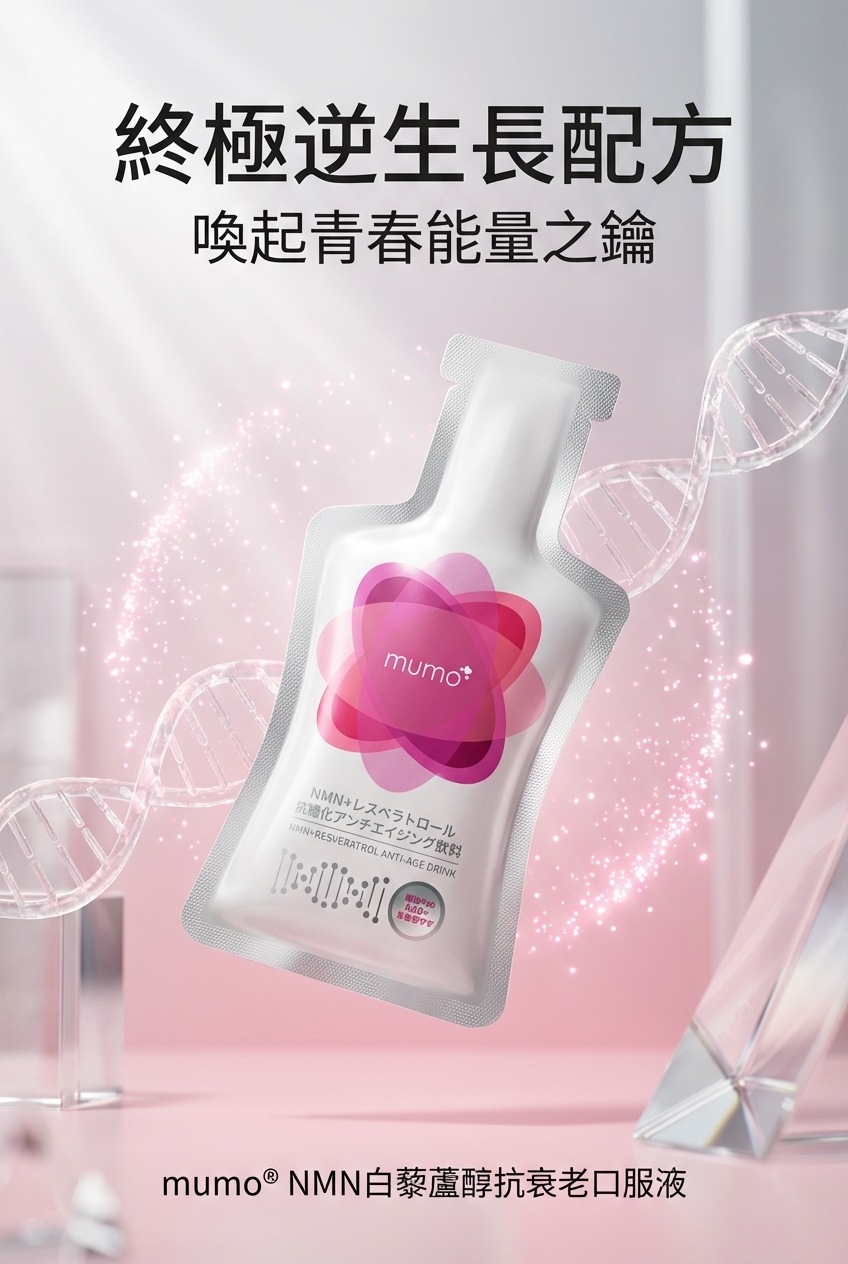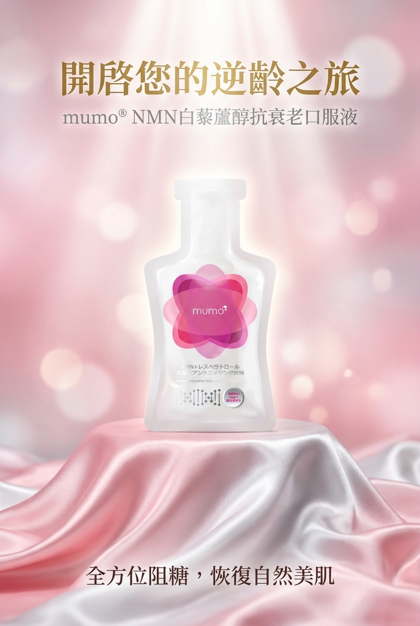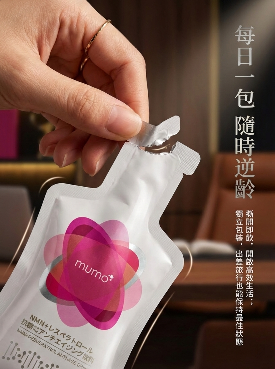 mumo® NMN白藜蘆醇抗衰老口服液特別運用懸浮液態狀設計,每包mumo口服液的白藜蘆醇含量高達205毫克,從口腔黏膜已開始吸收,比一般膠囊有更高滲透性,大大提高可吸收利用率,更特別加入經科研證實能延緩衰老效果的★NMN (β-煙酰胺單核苷酸) 每包含500mg毫克(*等同一般膠囊類2,375毫克的身體真正吸收利用率),有效激活NAD+(諾加因子),再配合3大專利成份: SkinAx2™法國專利複合植物萃取/日本專利櫻花提取物/專利蘋果萃取,能全面減少AGEs(糖化終產物) ,強效延緩老化,喚起青春能量之鑰,全方位抗衰逆齡!