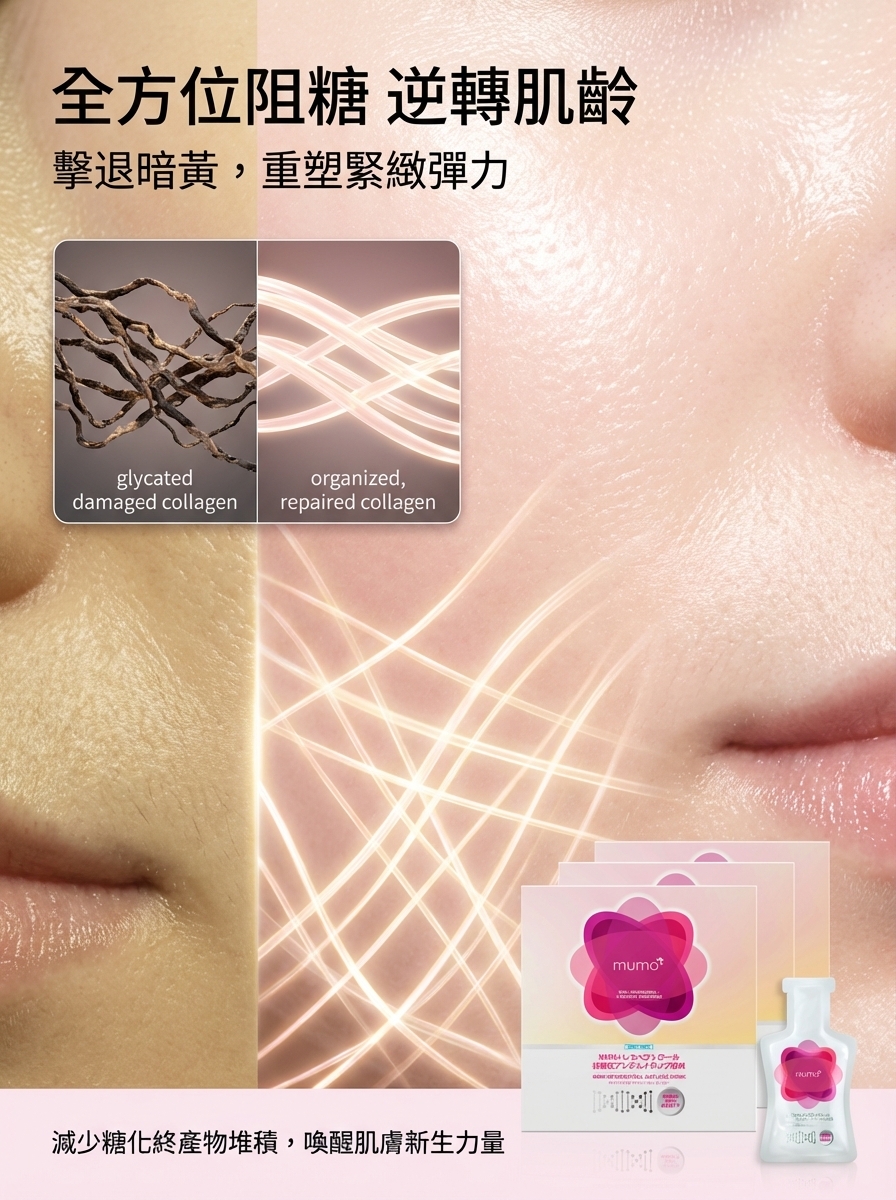 有效抑制糖化最終(AGEs),維持肌膚彈力,防止膠原蛋白流失,強化細胞防護力。