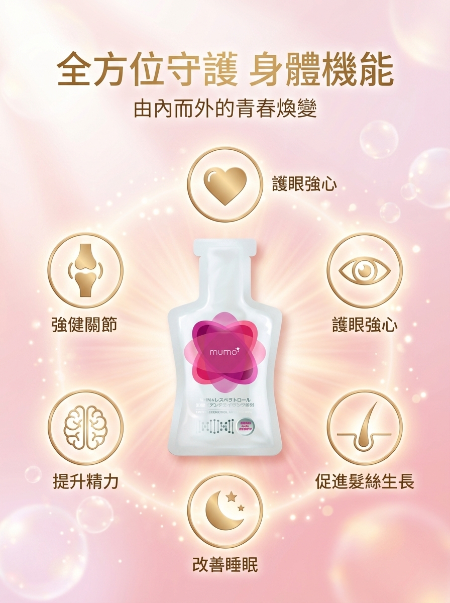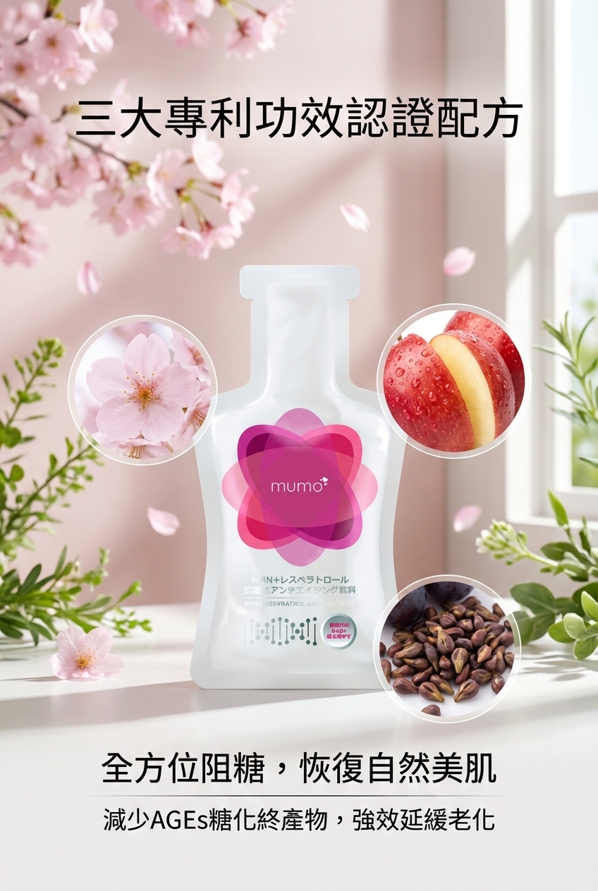 mumo® NMN白藜蘆醇抗衰老口服液特別運用懸浮液態狀設計,每包mumo口服液的白藜蘆醇含量高達205毫克,從口腔黏膜已開始吸收,比一般膠囊有更高滲透性,大大提高可吸收利用率,更特別加入經科證實能延緩衰老效果的★NMN (β-酰胺單核) 每包含500mg毫克(*等同一般膠囊類2,375毫克的身體真正吸收利用率),有效激活NAD+(諾加因子),再配合3大專利成: SkinAx2法國專利複合植物萃取/日本專利櫻花提取物/專利蘋果萃取,能全面減少AGEs(糖化終產物) ,強效延緩老化,喚起青春能量之鑰,全方位抗衰逆齡!
