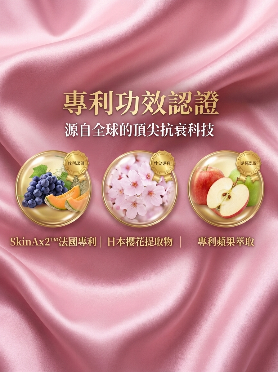 配合3大專利成: SkinAx2™法國專利複合植物萃取 + 日本專利櫻花提取物 + 專利蘋果萃取,減少AGEs(糖化終產物)延緩老化,能全方位提升抗衰逆齡