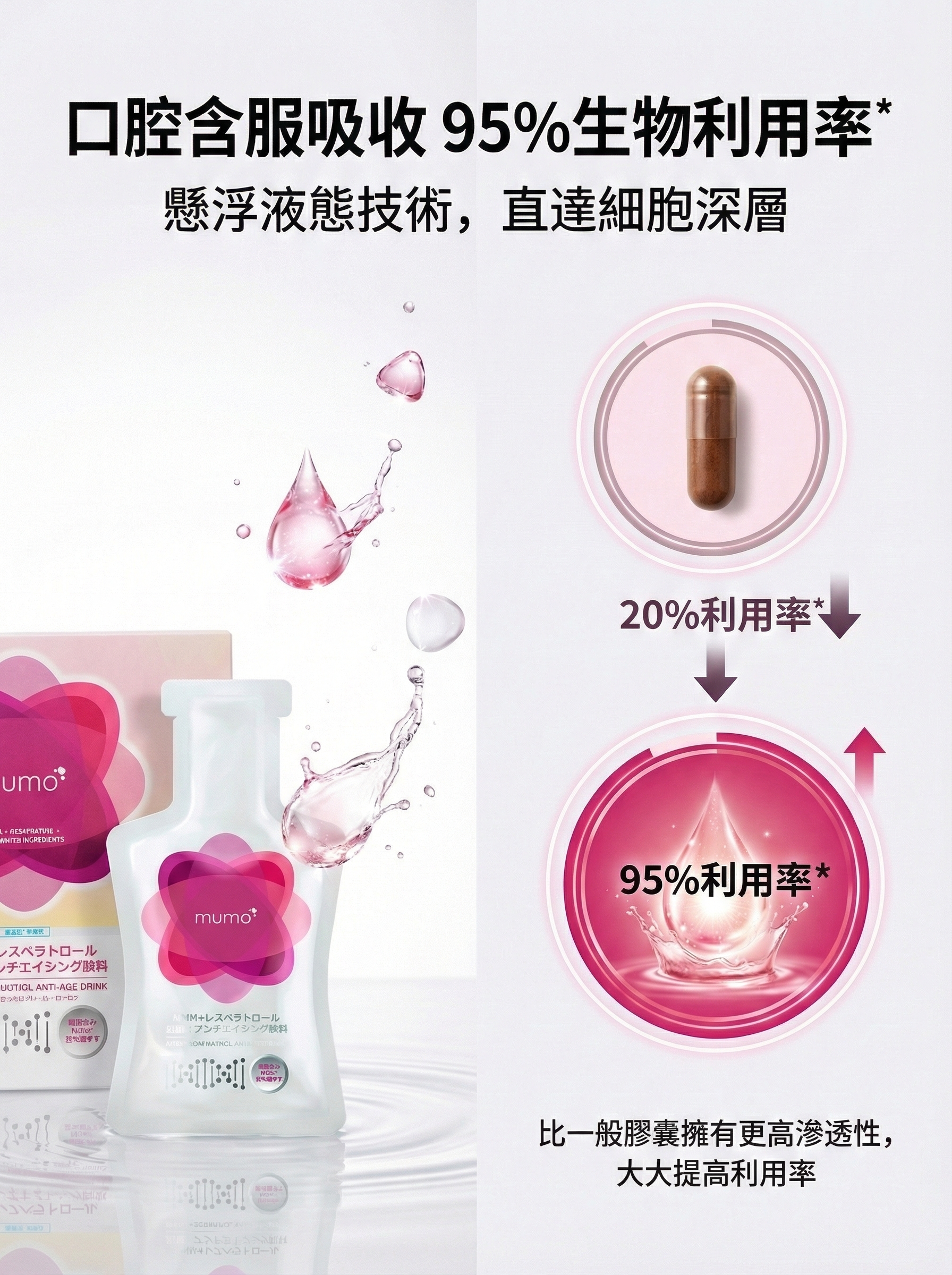 懸浮液態狀設計,口腔黏膜開始吸收,利用率高達95%^,比丸及粉劑有更高滲透性,大大提高可吸收利用率。