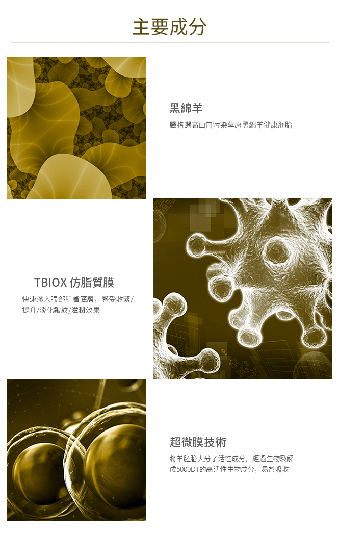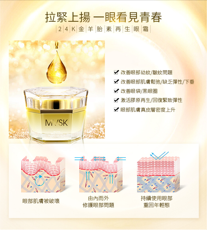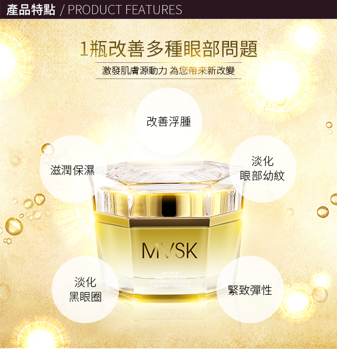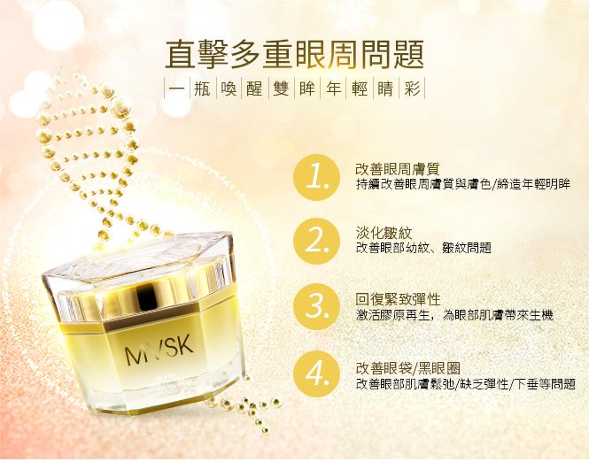 為眼部肌膚帶來無限賦活生機:一舉撫褪黑眼圈,浮腫,幼紋及皺紋,持續改善眼周膚質與膚色,為妳締造年輕明眸。