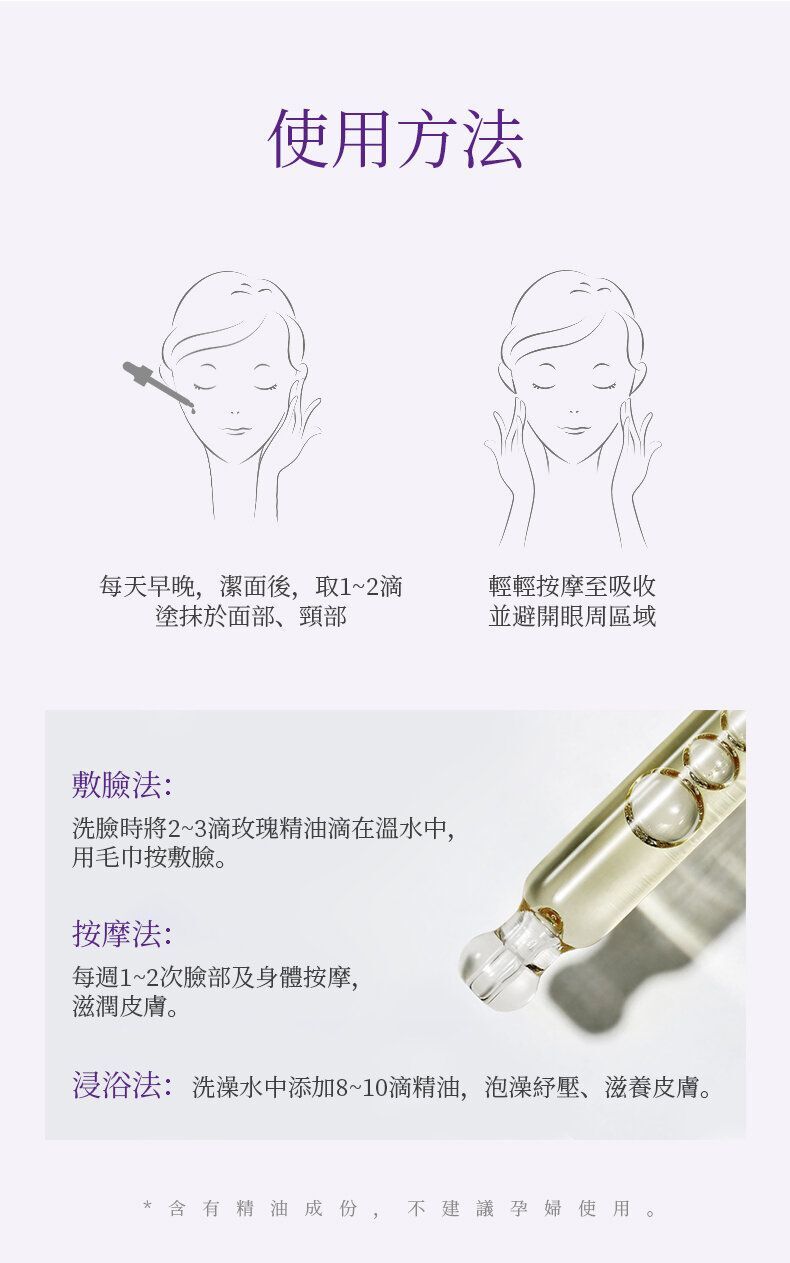 保養法:每天早晚,潔面後,取1~2滴塗抹於面部、頸部,輕輕按摩至吸收,並避開眼周區域。